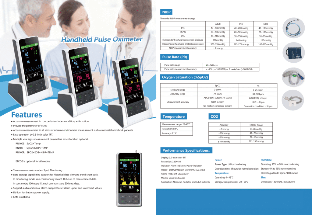 Accurate measurement in all kinds of extreme environment measurement such as neonatal and shock patients.• Easy operation by 3.5-Inch color TFT.